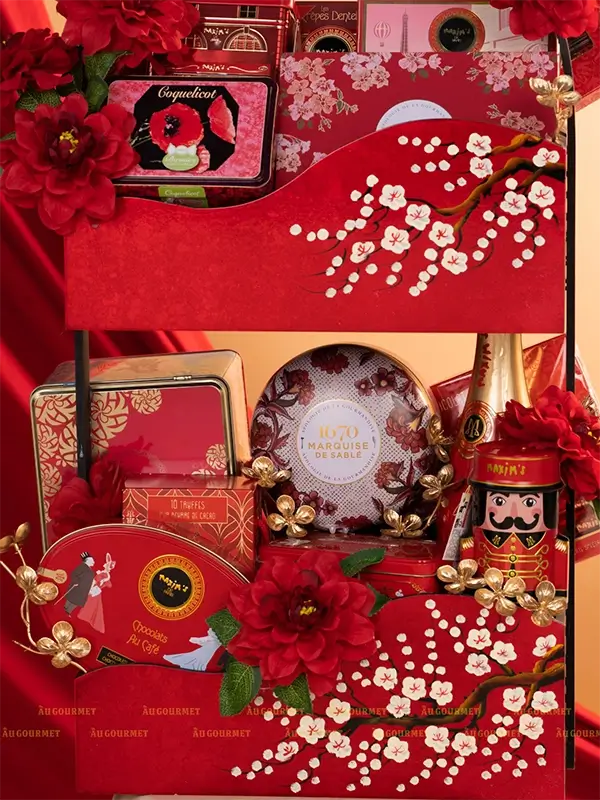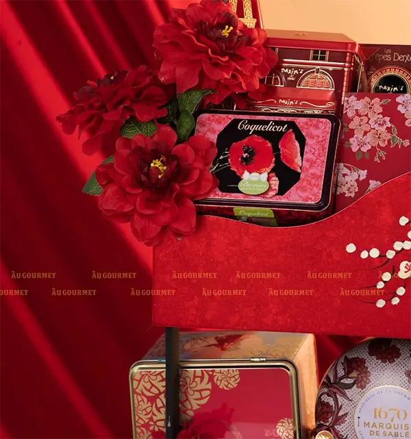 Set quà Tết kết hợp hài hòa giữa sắc đỏ truyền thống và tinh thần thưởng thức tinh tế của ẩm thực châu Âu. Thiết kế đỏ mận tạo nên tổng thể sang trọng, nổi bật nhưng vẫn giữ được vị Tết ấm áp rất riêng.