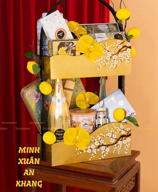 Điểm nhấn trung tâm của set quà là chai champagne được đặt trang trọng ở tầng giữa, như biểu tượng cho niềm vui, sự hân hoan và những khoảnh khắc đáng nhớ trong dịp Tết. Ánh kim của chai rượu phản chiếu cùng sắc vàng giỏ quà đầy sang trọng.